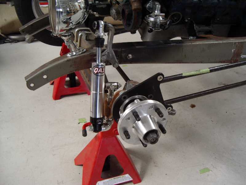 To be Superbell I-beam axle, cross sprung, split hair pin type radius rods with QA1 single adjustable shocks.